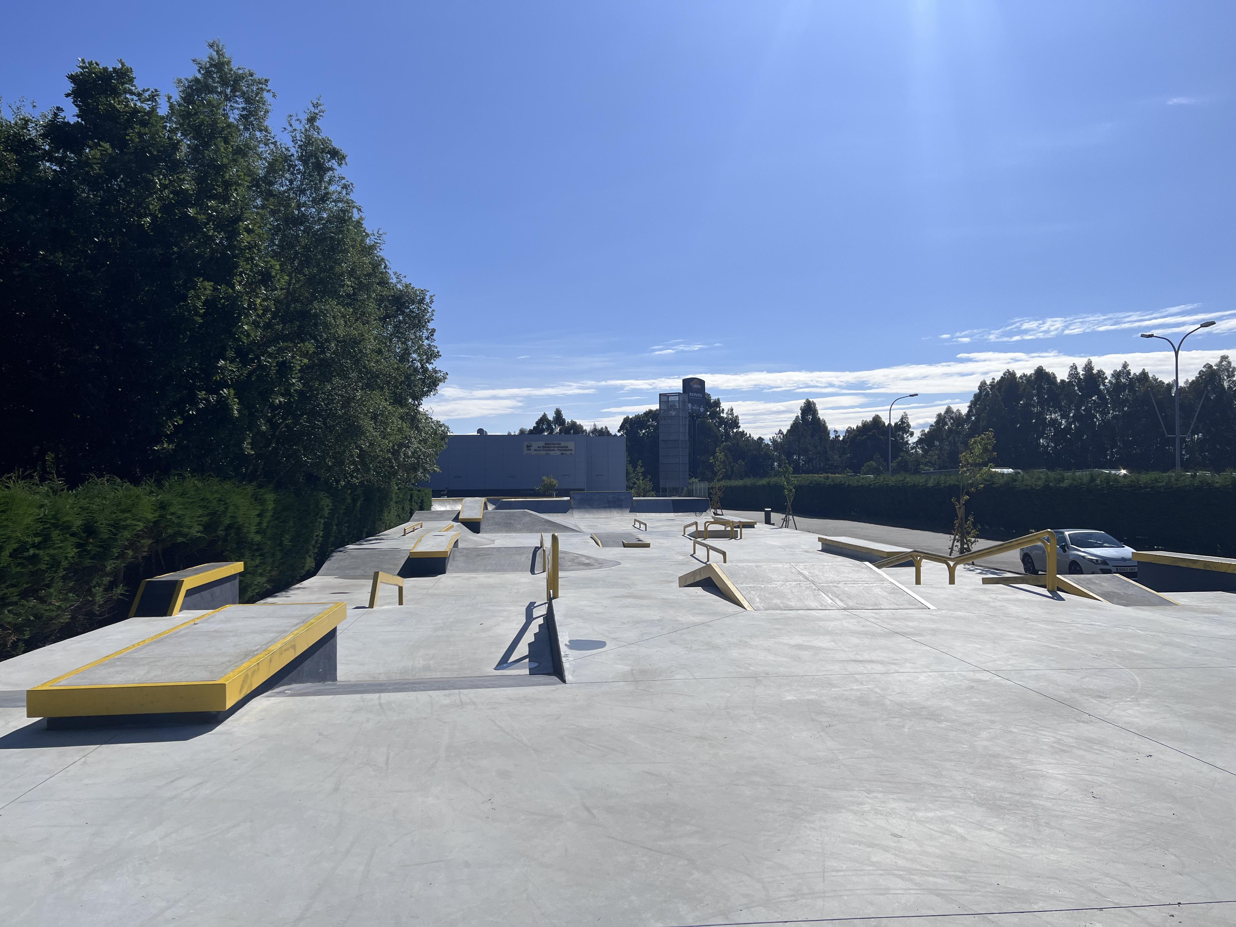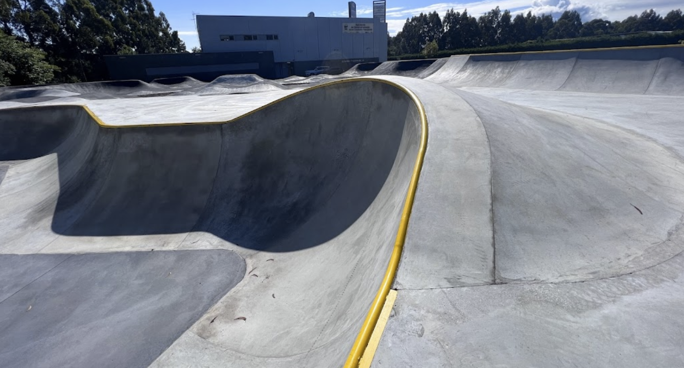 En el entorno verde de A Cañiza (Pontevedra), este skatepark de concreto reúne una gran plaza de street, una zona de flow con transiciones suaves y, justo al lado, un pumptrack de asfalto para completar la experiencia.