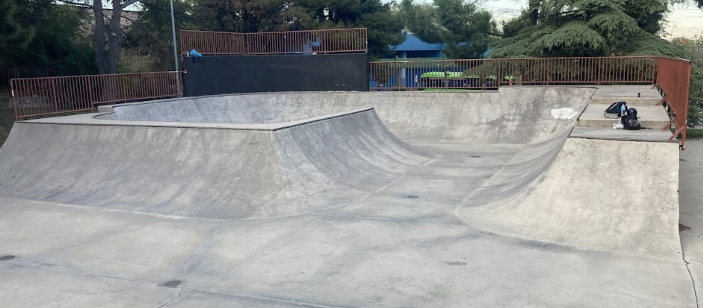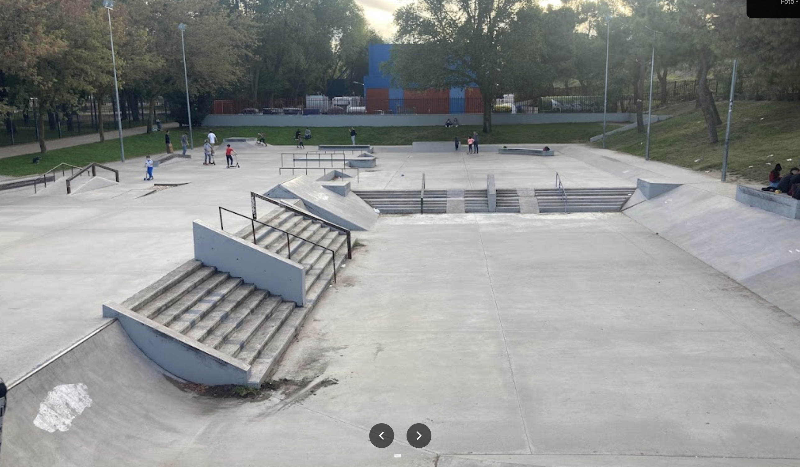 Skatepark de cemento con zona street con barandillas, escaleras y planos inclinados y zona de bowl.
