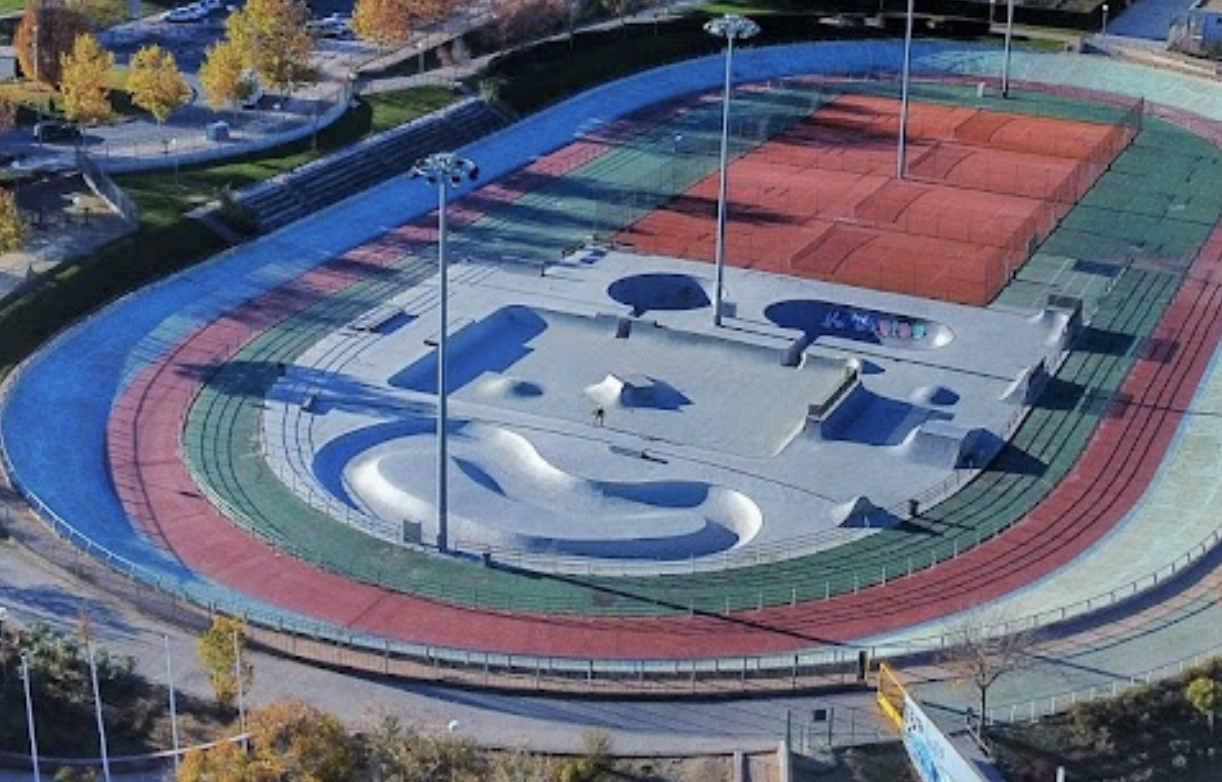 Skatepark de cemento con bowls de varias alturas, cajones, quarters, hips, pole jams y rails.